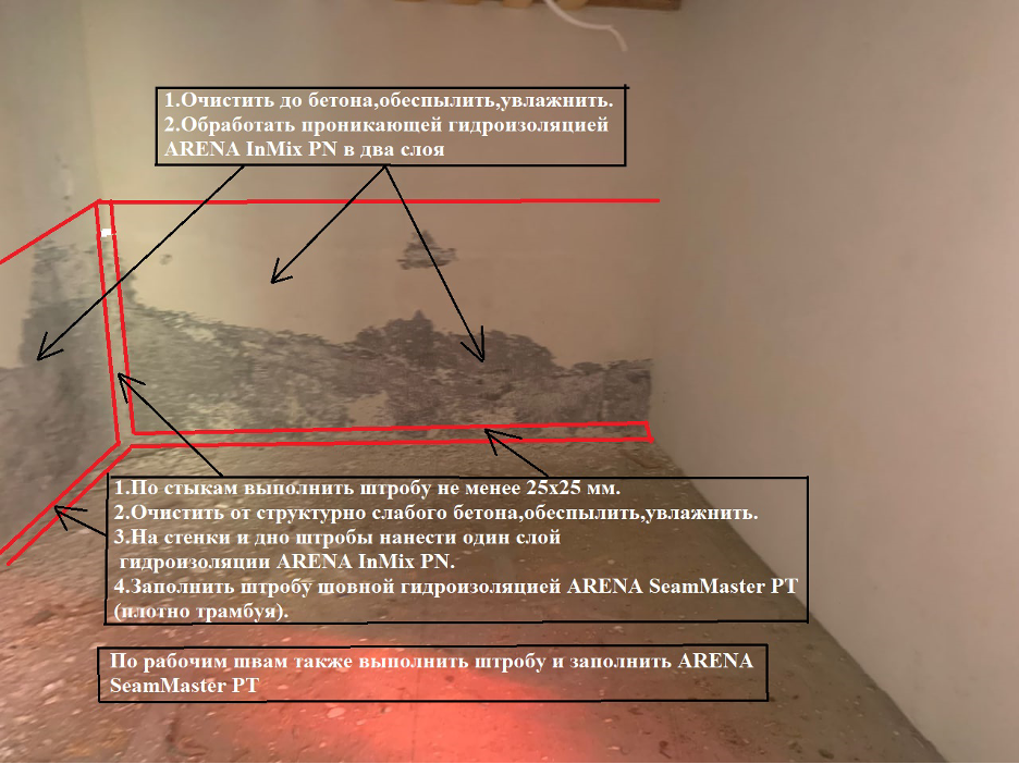 Рекомендации по гидроизоляции бетонных конструкций подвала Используемые материалы: 1.ARENA SeamMaster PT шовная гидроизоляция (норма расхода 1,5 кг/ на 1п.м.). 2. ARENA InMix PN проникающая гидроизоляция (норма расхода 1,0 кг/ м2 на два слоя). 1. Нанесение гидроизоляции ARENA InMix PN в местах по намокшему бетону стен Подготовка основания Очистить бетонные поверхности от старой штукатурки, структурно слабого бетона грязи, мелких частиц обеспылить и обильно увлажнить. Приготовление растворной смеси ARENA InMix PN Готовить такой объем растворной смеси, который можно выработать в течение 20 минут с момента добавления воды в сухую смесь. Оптимальная температура воды затворения 20⁰С. Смешать сухую смесь с водой в пропорции: 0,35-0,45 л воды на 1 кг сухой смеси или 1 часть воды на 2 части сухой смеси по объему. Смесь перемешивать в течение 3 минут вручную или с помощью низкооборотной дрели. Внимание! Растворную смесь во время использования необходимо регулярно перемешивать для сохранения