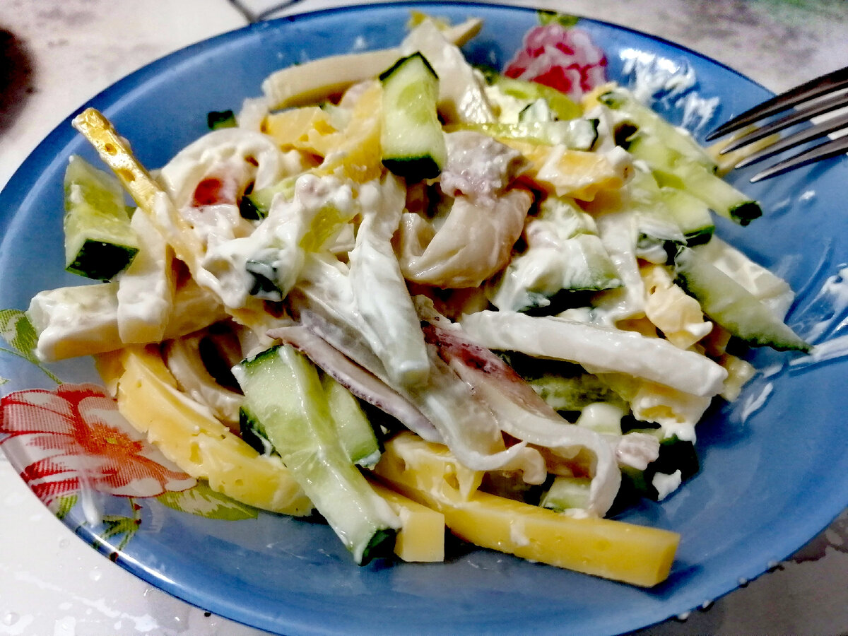 - Кальмары почистить. Отварить в течение 2-3 минут (главное не переварить, т.к. мясо станет как резина). Дать остыть и нарезать соломкой.