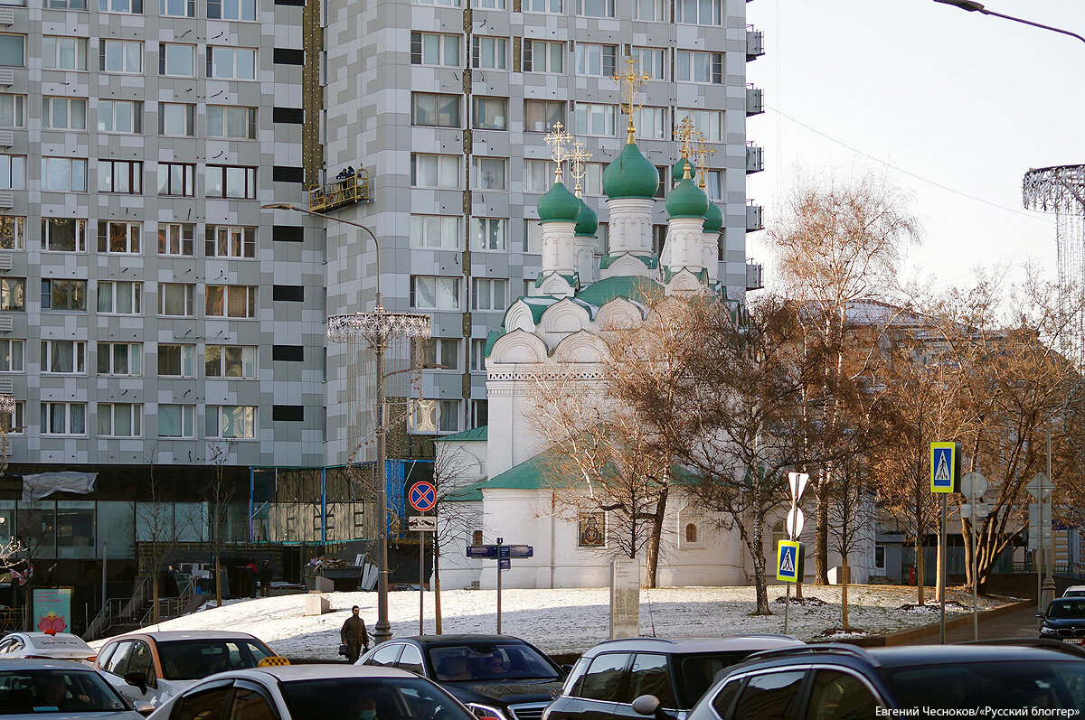 Поварская улица, 5с1 – храм преподобного Симеона Столпника (Введения во храм Пресвятой Богородицы). Пятиглавый храм с шатровой колокольней был сооружён в 1676-1679 годах по велению царя Феодора Алексеевича. В нём тайно венчались граф Николай Шереметев и крепостная крестьянка Прасковья Жемчугова-Ковалёва, сюда приходил на причастия и исповеди литератор Николай Гоголь. При советской власти богослужения запретили, в 1938 году здание передали Райпромтресту под размещение мастерских для глухонемых, а во время застройки проспекта Калинина многоэтажками существование храма оказалось под угрозой: говорят, что исторический памятник спас от сноса реставратор Леонид Антропов, залезший в ковш экскаватора. Храм Симеона Столпника был взят под государственную охрану, в 1966-1968 годах отреставрирован и приспособлен под выставочный зал Всероссийского общества охраны природы. Выставки пернатых и мохнатых домашних питомцев сменились экспозициями живописи и народного искусства, а в 1990 году на купола установили кресты, храм вернули верующим.