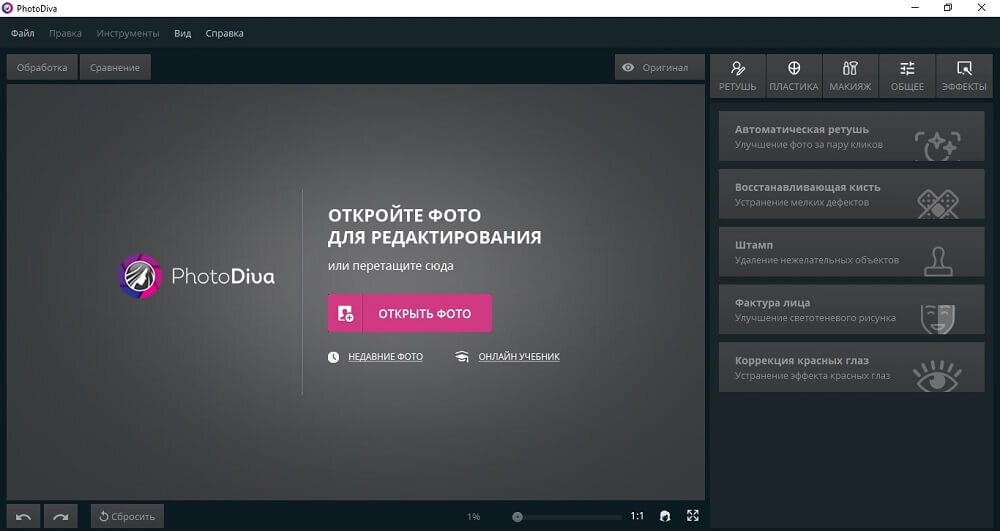 Чтобы сделать хорошую фотографию, недостаточно иметь дорогую камеру. Чтобы научиться делать хорошие снимки, требуется время. Но чтобы сделать хорошее селфи, нужно приложить не меньше усилий. И его могут испортить такие мелочи, как незамеченный прыщик или темный круг под глазом. Если вы хотите обновить свой аккаунт эффектным селфи, но у вас нет времени на макияж, не волнуйтесь. В этой статье мы собрали несколько способов с помощью которых вы сможете легко убрать мешки под глазами в Фотошопе. Как убрать мешки под глазами в PhotoDiva PhotoDiva Photo Editor помогает обрабатывать портретные изображения и быстро избавляться от различных несовершенств. Программа имеет набор автоматических функций и фильтров, поэтому действия сводятся к минимуму. Все, что вам нужно сделать, это выбрать нужный пресет и применить его. Установите PhotoDiva Загрузите установочный файл с веб-сайта. Дважды щелкните на файле дистрибутива, чтобы начать его распаковку. Следуйте инструкциям программы установки, которые