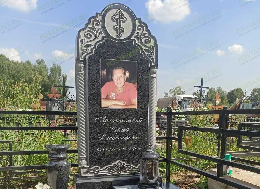 Резной мемориальный комплекс с лампадой, вазой и закрытым цветником создан по авторскому проекту. Высокая, массивная стела по бокам украшена колоннами, низ и верх оформлен орнаментом, на вершине - православный крест в круглой рамке. Бетонный фундамент приподнят и облицован гранитной плиткой. На надгробную плиту нанесли эпитафию. Изготовлен мемориал из карельского Габбро-Диабаза и установлен на кладбище Калитниковское. В центре композиции цветной портрет на итальянской, высокопрочной керамике. Такая фотография прослужит очень долго. На обратной стороне стелы выгравирован ещё один портрет покойного в полный рост, на его любимом "железном коне". Сварная ограда из нержавеющего металла обработала антикоррозийным составом и покрашена чёрной краской для металла. В компании Постамент можно заказать памятник на могилу по цене завода производителя. Мы предоставляем разнообразные изделия и услуги по обустройству захоронений "под ключ". Если есть вопросы, звоните +7(495) 201-32-27 ежеднев