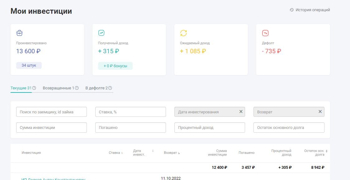 День добрый всем, кто интересуется. В той статье я писал, что процесс пошел не совсем так, как хотелось бы. С тех времён новых данных не появилось. Люди всё так же нуждаются в деньгах, занимают и отдают. Или не отдают. Бывают разные жизненные ситуации. Сегодня я обратил внимание, что интерфейс сайта обновился. Точнее не так, информация на сайте стала более информативной что ли... Появились обновления в части аналитики. Стало симпотичнее что ли.... Самое интересное на второй картинке в галерее - там отображены ожидаемый возврат средств. И основной суммы, и процентов. Может добавят опцию "уже получено", но это мои домыслы. Что там на самом деле будет - будущее покажет. Можно по месяцам (как на картинке), а можно и по неделям. Лично мне по месяцам достаточно, может когда нибудь потом и недельные ожидания буду использовать. А пока помесячно мне достаточно. Обращаю внимание, что сентябрь отображает только будущие платежи. То что уже получено уже не отображается. Ну и самая большая сумма б