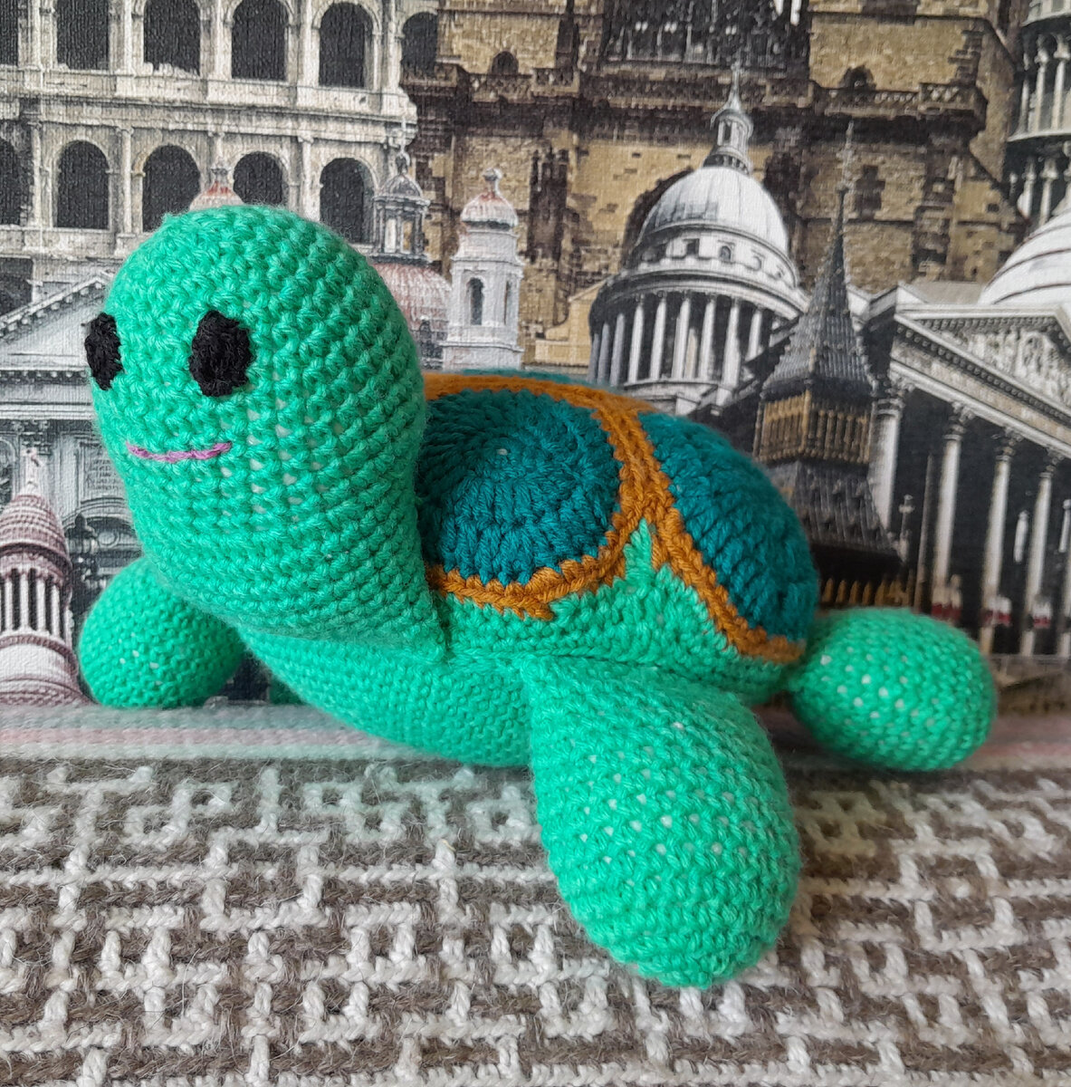 Сегодня будем вязать забавную черепаху - подушку. Длина готового изделия около 36 см в длину Предлагается акриловая пряжа 198 г/180 м, по мотку пряжи светло-коричневого цвета, чайный лист, тимьян. У меня в наличии таких цветов не оказалось, поэтому вязала из того, что было в наличии - темно-зеленая (назовем условно пряжа А), светло-зеленая (пряжа В) и горчичная (пряжа С). Вы можете выбрать пряжу любого цвета: желтую, оранжевую, синюю и т.д., это же игрушка. Для глаз и рта немного черной пряжи. Размер крючка 3,75 — 4 мм. 3 в.п. для подъема в начале ряда считается за ст.с/н, если не указано иное. Соединение осуществляется с помощью соединительной петли, если не указано иное. Итак, начнем вязать. Панцирь. Панцирь черепахи состоит из 7 мотивов. 1 ряд. Вязание начинается пряжей цвета А. Связать 6 ст.б/н в круг из 2 в.п. (всего 6 ст. б/н) 2 ряд. 2 ст.б/н вяжется в каждый ст.б/н первого ряда, соединить. (всего 12 ст. б/н) 3 ряд. 3 в.п., 2 ст. с/н в эту же петлю, потом 3 ст. с/н в следующую,
