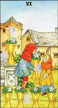 #таро Символика: 1. Старый дом - прошлое. 2. Стражник - защита и уверенность. 3. Цветы, растущие из Кубков - прекрасные воспоминания. 4. Играющие дети - тёплые воспоминания о детстве. 5. Мальчик дарит девочке кубок с цветами - беззаботность/доверие. Полный образ: Шестёрка Кубков символизирует тёплые воспоминания о прошлом, возможно, о детстве, встречу с людьми, которые напомнят о прошлом и возвращение к старым делам. Что показывает Шестёрка Кубков: гадатель с теплотой вспоминает прошлое. Приятные воспоминания подталкивают к возобновлению пройденного этапа. Что советует Шестёрка Кубков: гадателю следует вспомнить, чего хотел ранее от ситуации и понять для себя, есть ли ещё потенциал у данной темы вопроса. Что обещает Шестёрка Кубков: гадателю знаком этот путь, и он не прочь пройти его снова, потому что у него нет никаких негативных ассоциаций, лишь приятные воспоминания. Гадатель также может встретить людей, которые были дороги ему в прошлом.