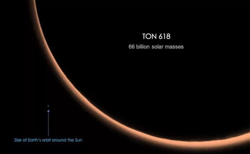 Солнечная масса: 6,6 × 10 10 Тон 618 - это гиперлюминиевый квазар, расположенный в 10,37 миллиардах световых лет от Земли. Он содержит самую большую черную дыру [известную человечеству], вес которой в 66 миллиардов раз превышает массу нашего Солнца. Впервые он был обнаружен в 1957 году при съемке слабых голубых звезд, которые не лежат на плоскости Млечного Пути. Более детальное радиообследование, проведенное в 1970 году, определило TON 618 как квазар. TON 618 считается аккреционным диском чрезвычайно горячего газа, циркулирующего вокруг массивной черной дыры в центре галактики. Это так ярко, что затмевает остальную часть галактики. Фактически, это один из самых ярких объектов во Вселенной со светимостью 4 × 10 40 Вт, что эквивалентно 140 000 миллиардов раз больше Солнца. Поскольку газ в аккреционном диске движется с очень высокой скоростью (около 7000 км / с), черная дыра создает исключительно сильную гравитационную силу. И горизонт событий такой массивной черной дыры будет 2600 а.е. в
