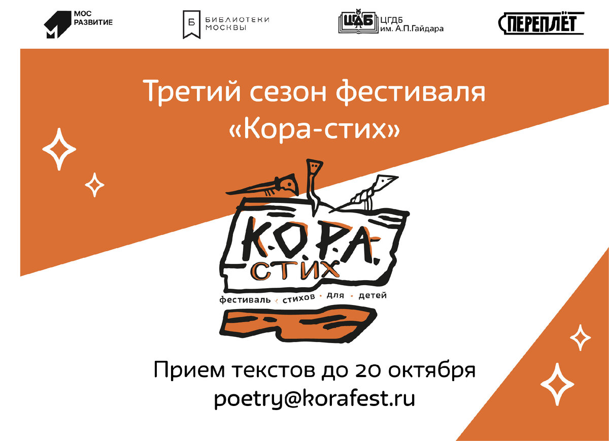 Центральная городская детская библиотека им. А. П. Гайдара и журнал о детской литературе «Переплет» объявляют о начале третьего сезона фестиваля «Кора-Стих». Как и в прошлые сезоны, мы ждем большие эпические истории в стихах (поэмы, пьесы, сказки и так далее) и подборки стихотворений, объединённые одной темой. В состав литературного совета фестиваля этого года вошли: Герман Лукомников, поэт, прозаик, палиндромист, перформансист, составитель антологий. Станислав Востоков, писатель и поэт Анастасия Шевченко, редактор издательства "Нигма" Прием рукописей по адресу poetry@korafest.ru Прием текстов до 20 октября. Фестиваль состоится 30 октября. Первый фестиваль «Кора-Стих» прошел 25 октября 2020 года, на него было прислано свыше 60 лиро-эпических произведений для детей и подростков. Самыми популярными жанрами были сказки и тематические циклы стихотворений. На второй конкурс прислано более 50 работ. «Кора» — это зимний фестиваль короткого рассказа, который придумали писатель Алексей Олейни