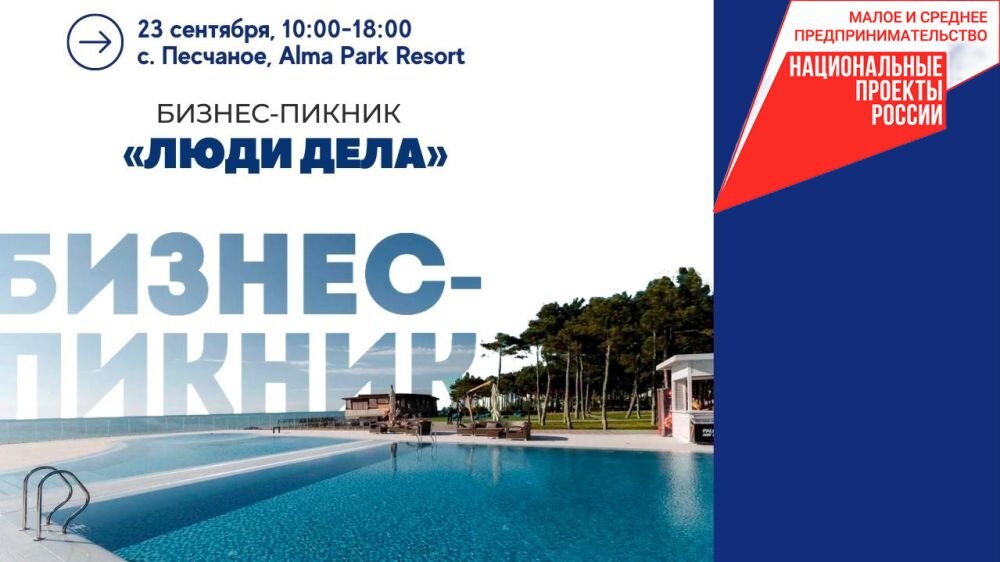 Бизнес-пикник «Люди дела» пройдет 23 сентября с 10:00 до 18:00 по адресу: Бахчисарайский район, с. Песчаное, ул. Набережная 11Б, литера Д, Alma Park Resort. Участие – бесплатное, обязательна предварительная регистрация.