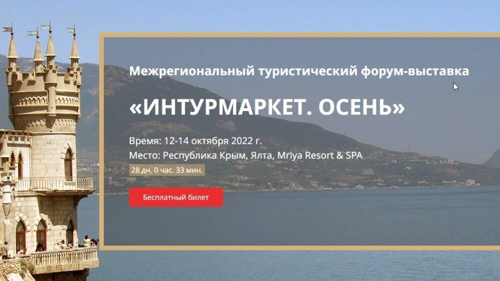 12-14 октября 2022 года в г. Ялта состоится масштабное деловое мероприятие, объединившее крупнейший федеральный отраслевой бренд и региональное профессиональное событие – Межрегиональный туристический форум «Интурмаркет. Осень». Форум пройдет в гибридном формате, объединив офлайн-мероприятия с онлайн-трансляцией.
