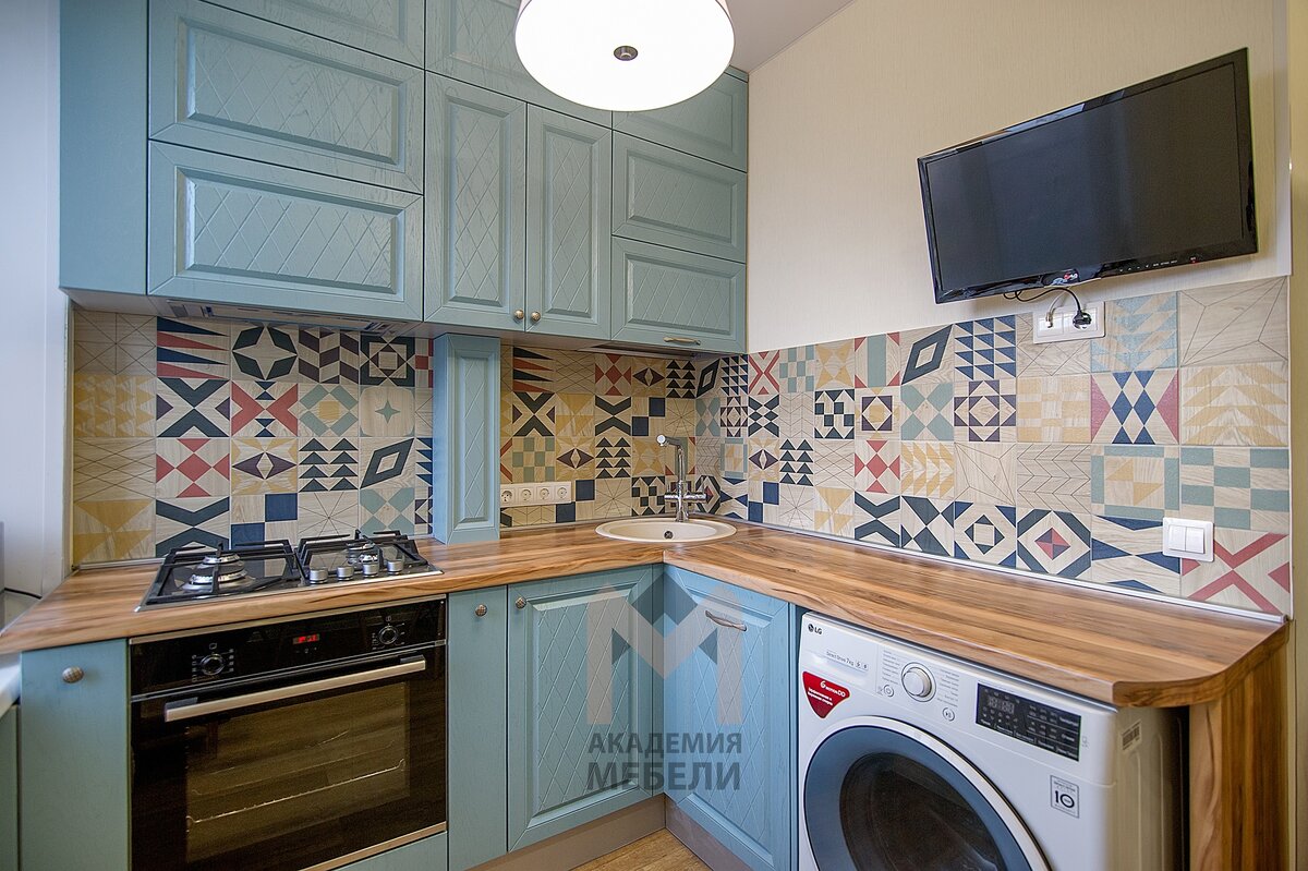 Установили кухню на Воскресенской, 105. Как вы относитесь к голубой кухне? Голубой цвет считается одним из самых спокойных и умиротворяющих. Для оформления кухни он не очень популярен, что связано с его способностью оказывать негативное влияние на аппетит. Но, согласитесь, для многих это может оказаться даже преимуществом! Оформленная же в лазурных тонах кухня, при правильном подходе к интерьеру, может выглядеть очень стильно и гармонично. И в своём проекте мы успешно это доказали! Отличительной особенностью голубого является его способность делать пространство визуально легким и воздушным. Происходит это благодаря светлости тона. А его сочетание с коричневым — один из классических вариантов цветовой композиции. И, если в качестве коричневого использовать фактуру дерева, то она избавит голубой от излишней холодности, придаст всему помещению комфорта и уюта. Этот момент наши дизайнеры тоже взяли на вооружение при создании данного проекта. Что касается размеров кухни, то опытные специали