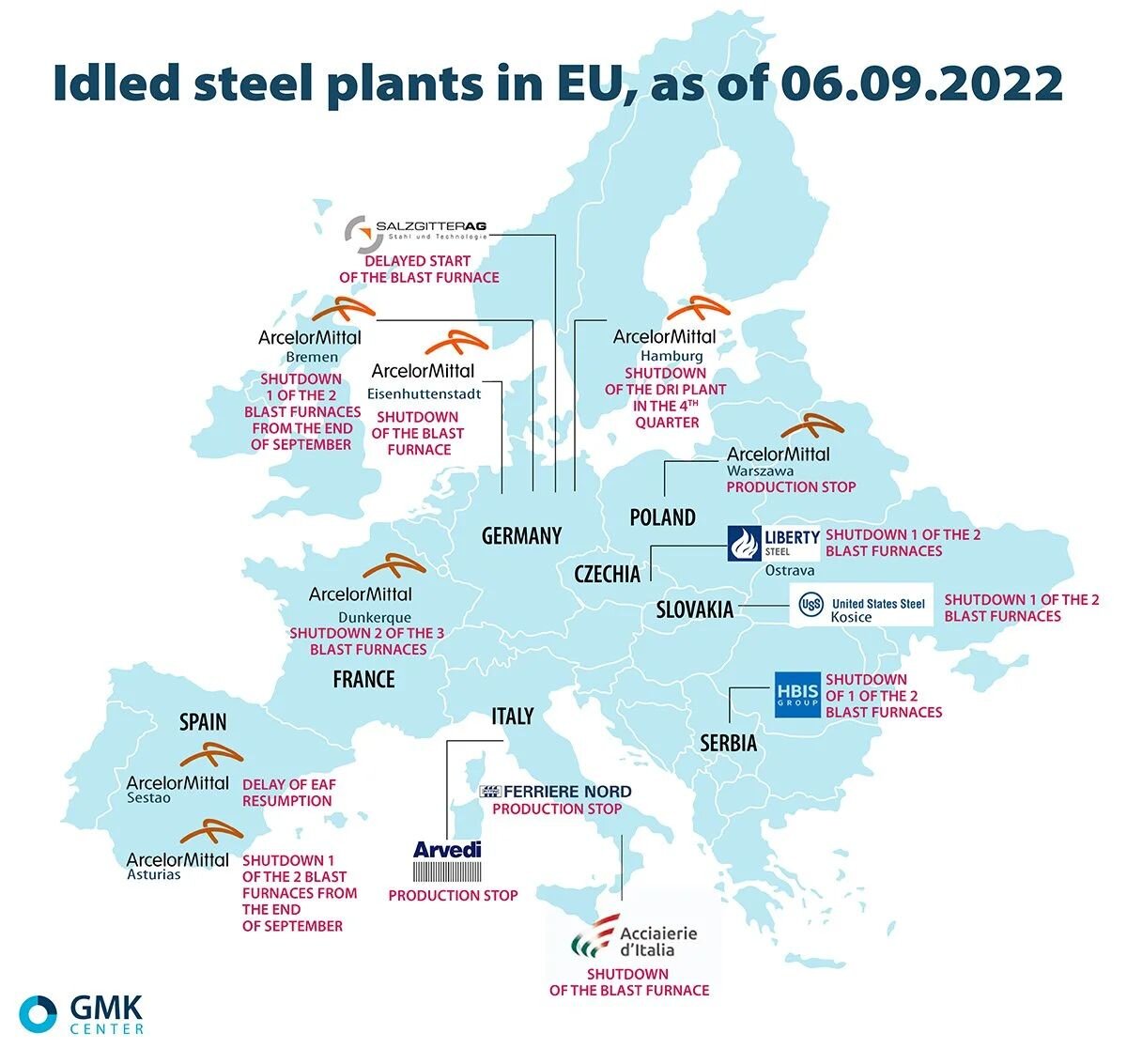 На картинке сверху — приостановленные сталелитейные заводы в Европе. Газ дорогой, электричество дорогое, выплавлять сталь становится невыгодно. А если Евросоюз не прекратит скотничать, электричество так и останется для него дорогим. Скоро заводы придётся останавливать полностью, гасить доменные печи. Для некоторых заводов это будет означать банкротство, так как перезапускать доменные печи очень невыгодно.