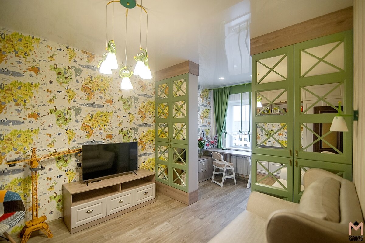 А ещё, в результате такого зонирования, выделилась комфортная зона отдыха, которая выглядит как небольшая уютная гостиная. В ней есть удобно расположенная тумба для телевизора. А также в этой части комнаты находится гардеробная, представленная двумя распашными шкафами, вместительными антресолями и ящиками, где хватит места для всех вещей ребёнка. Среди шкафов и ящиков выделена оригинальная и уютная детская зона для игр.