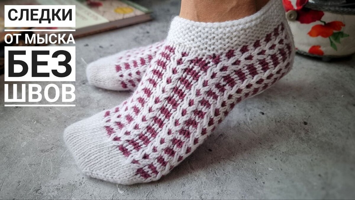 Тапочки-следки от мыска спицами без швов. Двухцветный узор