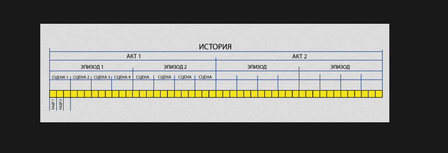 Немного сложнее : Здесь мы по горизонтали обозначаем наши 5 актов, а по вертикали берем основные сюжетные линии: главная линия, главный персонаж, его антагонист, отношения... В итоге, на пересечении в ячейке мы можем отметить, как мы вводим в историю протагониста и антагониста (для первого акта), как меняются основные взаимоотношения/акценты от акта к акту и т.д...