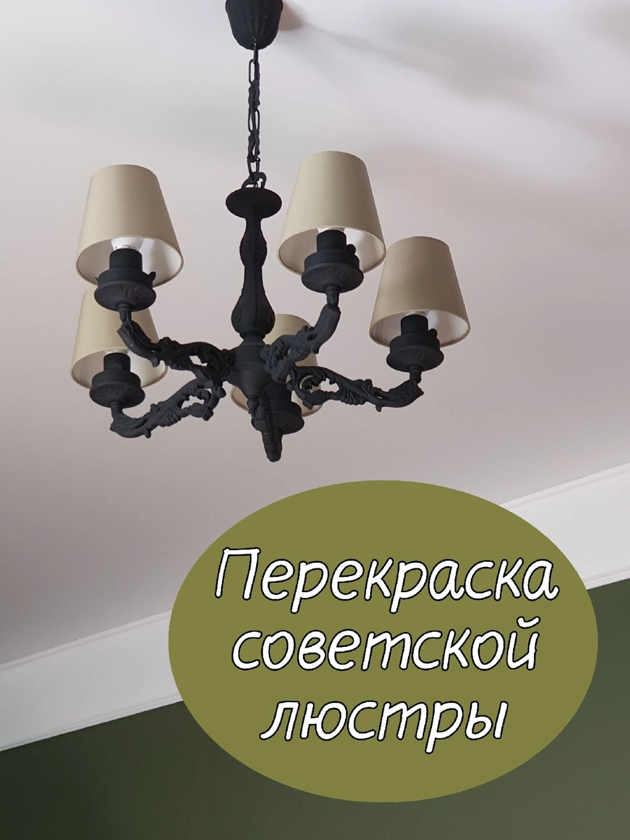 Мастерица: Матаева Наталья И снова моя старая люстра из советского прошлого поменяла свой наряд. На этот раз из-за ремонта в комнате. Обновление и внесение черных акцентов и на люстре сказалось. Прошу нелюбителей черного цвета в интерьере просто пройти мимо😄 У меня такого в доме не было еще, я решила добавить и мне нравится . Когда все будет готово я покажу обзор комнаты полностью, а пока детали. 👇🏼 До перекраски люстра уже была пркрашена меловой краской и патинирована белым воском. Теперь я просто перекрасила черным меловым бархатом от Aturi Design.🖤 Этой меловой краской можно запросто перекрашивать старые люстры, бра, подсвечники. Можно предварительно загрунтовать, я здесь красила без грунта. ⠀ Люстра до перекрасок 👇🏼 Я даже, в отличие от мебели, не стала покрывать никаким финишем: ни лаком, ни воском. Воздействия не будет, максимум смахнуть иногда щеточкой пыль. ⠀ Про абажуры - они зеленого приятного оттенка, фото плохо передает цвет. Но идеально смотрелись со стенами д
