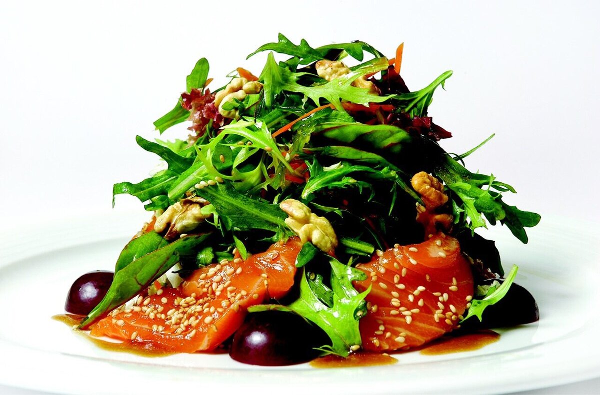 Всем Привет! Рада приветствовать Вас на моём канале! Сегодня представляю вашему вниманию Салат совершенно не русский,в прочем как и все салаты с листьями. Для приготовления этого блюда вам понадобятся следующие ингредиенты: Приготовим: Салатные листья промыть,просушить.Виноград промыть, просушить, разрезать пополам,удалить косточки.Лосось нарезать выложить на тарелку полить соусом терияки посыпать кунжутом.В удобной для смешивания миске соединить салат микс, масло оливковое ,сок лайма и грецкие орехи поломанные на 2-4 части,перемешать На тарелку выложить семгу подпереть виноградом и поверх неё выложить салат микс. Ничего сложного - Быстро, просто, вкусно и полезно!!! Приятного Аппетита!!!