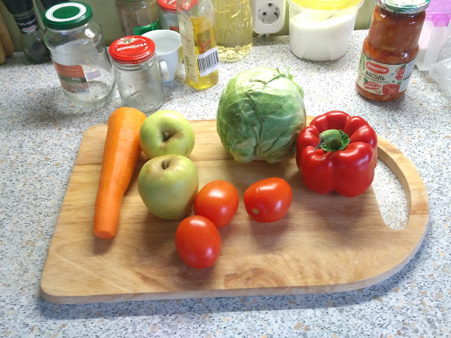 И в ней можно найти кусочек чего нить вкусненького, оставшегося с прошлого раза. Всё помыли, почистили, и приготовили Начинаем шинковать капусту Шинкуем моркофель Шинкуем яблоки Шинкуем перец Переходим к помидоркам. Тут придётся ножичком поработать. Не берёт шинковочка их, мнёт. Ну