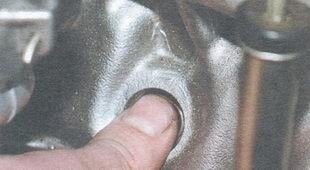 1. Снимите наконечник со свечи первого цилиндра и выверните ее. 2. Закройте пальцем свечное отверстие. 3. Поверните коленвал до начала такта сжатия в 1-м цилиндре (через свечное отверстие начнет выходить воздух). Затем, продолжая поворачивать коленвал, совместите метку г на шкиву коленвала (выделена мелом) со средней меткой б (если вы применяете бензин с октановым числом 92 или 95) или удлиненной меткой в (если вы применяете бензин с октановым числом ниже 92). Установите на место свечу зажигания 1-го цилиндра и подсоедините к ней высоковольтный провод. 4. Отсоедините шланг от вакуумного регулятора угла опережения зажигания.