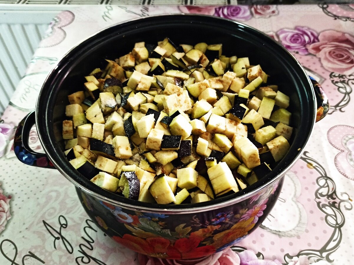Да, это все про баклажан. Очень интересная репутация. Этот полезный овощ, еще и не овощ, а ягода. Тоже нонсенс. Вот такое интересное растение. Много лет назад моя мама привезла из Волгодонска рецепт, которым я пользуюсь до сих пор. Это — закуска из баклажанов. Сделать несложно, но в холодные зимние месяцы это блюдо очень котируется. Берем 2.5 кг синеньких, режем кубиками, солим и часа на 2 оставляем. Занимаемся своими делами. Отжимаем баклажаны. Вскипятим 2.5 литра воды, 1/2 стакана уксусной эссенции (можно поменьше 1/3), 1/2 стакана соли. Добавим синеньких, и варим после закипания 10 минут. Смотрим, чтобы они стали мягкими, но не разварились. Выловим дуршлагом в марлю и под гнет. Можно на 1 - 2 часа. Я оставляю на ночь. Потом добавить 1.5 головки очищенного и измельченного чеснока и ½ стакана подсолнечного масла. Хорошо перемешать. Разложить массу по банкам, стерилизоват