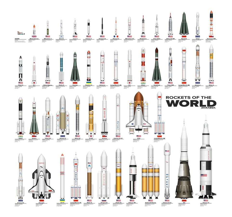 Когда еще, как не сейчас, взглянуть на прошедшие 2000 лет ракетостроения, увидеть, куда нас привели инновации прошлого и что ждёт нас впереди? Конечно, невозможно рассмотреть каждую из 51 ракеты на схеме, приведенной ниже, но я попытаюсь как можно лучше охватить всё от самых ранних начал в Китае до космической гонки и далее.