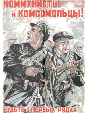 Если вспомнить и посмотреть на плакаты времен войны, то сразу бросается лозунг «Коммунисты – вперёд!».