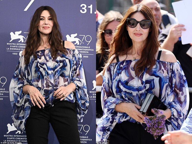Эта женщина ассоциируется с платьями, которые стали неотъемлемой частью её стиля. Красные, чёрные, кружевные, длинные и минималистичные, облегающие и очень женственные... Но иногда Моника отдает предпочтение брючным костюмам или нарядам, где блузка сочетается с брюками или юбкой. Так случилось и на Венецианском кинофестивале-2022. Для одного из выходов Беллуччи надела свободную блузку с классическими чёрными брюками прилегающего силуэта. Наряд она дополнила своими любимыми туфлями на платформе и высоченной острой шпильке. Когда Моника выбирает для красной дорожки или другого светского выхода не платье, некоторые поклонники расстраиваются. Эта женщина-дива просто создана для платьев, которые она носит царственно, выглядит них естественно и роскошно даже в свои почти 60 лет. Но если внимательнее посмотреть на образы Моники блузках, брюках и юбках, можно отметить, что некоторые ансамбли ничуть не хуже платьев. Беллуччи - звезда с классической женской красотой, которой безупречно подходит