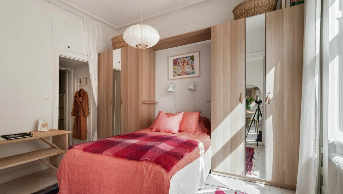 Дом начала века, высокие потолки и белые стены, льющийся из больших окон свет — что еще нужно для атмосферного скандинавского интерьера? Квартира модельера Карин Родебьер (Carin Rodebjers) находится в доме 1898 года, где сохранилось очарование рубежа веков — большие окна, высокие потолки, историческая лепнина. Карин вдохновилась мягким светом, льющимся в комнаты сквозь большие окна, и выбрала для интерьеров «скандинавскую» палитру с легкими, сдержанными красками — от белого и бежевого до спокойного серого и оттенков дерева. Просторную гостиную Карин использует не только для приема гостей и отдыха. Здесь у окна стоит большой деревянный стол, за которым можно и обедать, и работать в случае необходимости — для модельера важно иметь светлое рабочее место с широкой столешницей, на которой можно разложить ткани. Высокие двойные двери ведут из гостиной в одну из спален, которая залита светом из большого окна. По обе стороны от кровати стоят шкафы для одежды, они создают уютную камерную нишу.