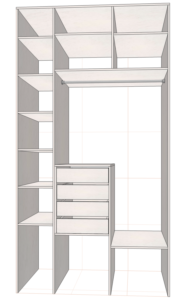 Сегодня расскажу тебе, мой читатель, про мою историю приобретения шкафа в спальню. Как ты уже догадался, я не отправлялся в мебельный магазин, не ходил часами по торговым центрам, отбиваясь от надоедливых консультантов. Да и не хотелось тратить на шкаф кругленькую сумму денег, которые в настоящее нестабильное время хотелось бы приберечь. Еще год назад, я бы, наверное, отправился в Икею, и за не сильно большую сумму денег приобрел бы внутренности шкафа ПАКС. Потом заказал бы классные фасады и успокоился. Фасады узкие, распашные, как сейчас модно. Сейчас же, при небольшом бюджете, я решил делать шкаф своими руками. На просторах интернета нашел программу для проектирования мебели. Выбрал одну из самых понятных, как мне показалось. Ею оказалась "Pro100". Нарисовал проект, получил список деталей с размерами. О процессе проектирования я расскажу в другой раз. Там довольно много нюансов. Чтобы не утопать в деталях, представлю твоему вниманию итоговый результат трудов проектирования. Секция с