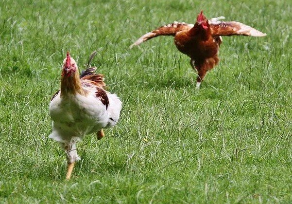 — Давай обежим вокруг сарая. Кто прибежит первым, тот возьмет себе всех курочек.