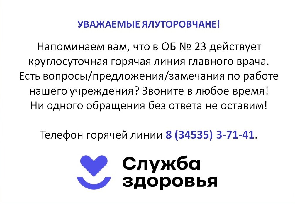 Уважаемые ялуторовчане! Напоминаем вам, что в ОБ № 23 действует круглосуточная горячая линия главного врача.