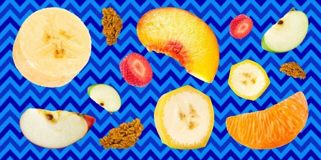 Почистите два апельсина, все груши, бананы и киви. Нарежьте их крупными кусочками вместе с нечищенными яблоками и нектаринами.
