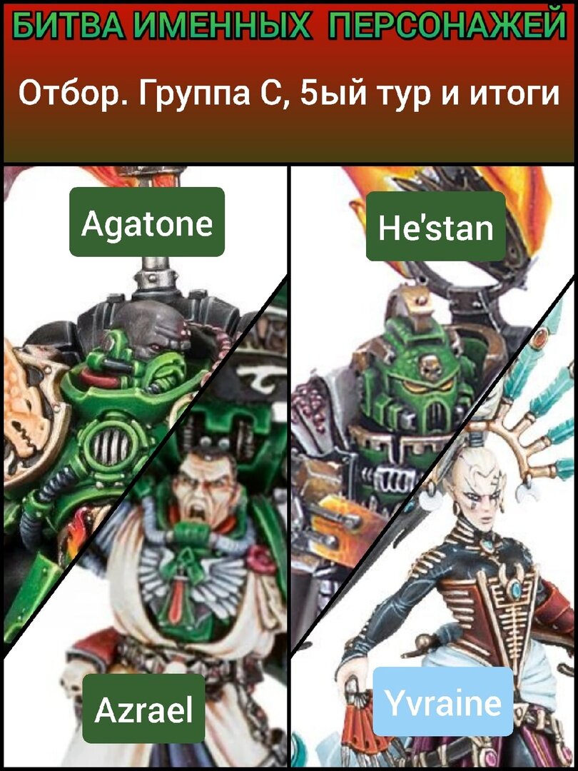 Приветствую всех на заключительном туре группы С, сегодня и определятся участник финального турнира и тот кто поборется за оное через серию игр навылет. Не будем тратить время на вступление и перейдём к мякотке) 5ый тур (Харальд отдыхает) Расклад я объяснил в итогах 4ого тура - Иврейн нужен свип, желательно с как можно большей разницей и поражение Агатона, тоже с как можно большей разницей Ге'стан - Иврейн Первый пункт, несмотря на отчаянное сопротивление Магистра Кузни, Иврейн выполнить удаётся, всё-таки 5 вунд против шквала морталок - это очень мало и Ге'стан занимает почётное последнее место. Однако эльдарке не удаётся нагнать лидера по разнице дамага и вся надежда теперь на Магистра Тёмных Ангелов Итог: 0-3(28) (1) Агатон - Азраил Несмотря на довольно скромное выступление, последнее слово Азраил ещё не сказал и дал жестокий бой победителю прошлого сезона 1 Раунд: Счёт: 0-1(9) 2 Раунд: Счёт: 0-1(8) 3 Раунд: Азраилу оба раза не повезло с чарджами, но если в первой битве всё было плох