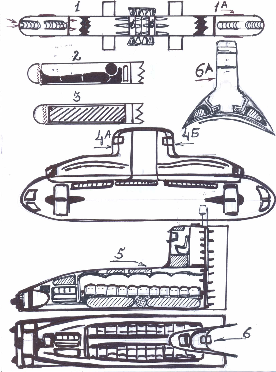 Всего каких то 300 лет назад, Российская Империя, располагала не только самым мощным надводным флотом, корабли которого были выполнены из цельно литых корпусов нержавеющей черной стали, но и самым мощным подводным флотом, корабли которого тоже сильно отличались как в технологическом так и проектном плане от нынешних. Предлагаю несколько рисунков, с изображением некоторых технологических решений, ваших допотопных предков. Дело в том, что в те времена, когда у машины, танка корабля или другой транспортной техники, выходила из строя задняя скорость, или реверсивное устройство, то на пульте управления загоралась аварийная надпись "Ал - Га", это первые две буквы от неких технических слов, о которых я так и не узнал, и по этому, все плавательные единицы, не имеющие полноценного заднего хода, назывались "Алгамаринами", а те единицы имеющие двухсторонний полноценный ход, назывались "Реверсмаринами". Ну а так как все нынешние плавательные средства, по конструкции являются алгамаринами, то ваши предки со временем при строительстве в военных технологиях, перешли на реверсмарины, так как при военных действиях на море, именно поворот или разворот судна или торпеды, являлся большим недостатком. 1 Реверсивная торпеда класса реверсмарин, состоящая из двух малых торпед класса алгамарин. Данная торпеда называлась "Панихида". У данной торпеды, было два отсека для полезного груза, диаметром примерно с современную 250 литровую бочку, и длинной в два метра. Торпеда могла нести, либо двух человек 2, либо два заряда 3, либо в задний отсек при выстреле на сверх дистанцию, заливался дополнительный запас сжиженного водорода, или аккумуляторную батарею. Когда торпеда шла в режиме реверсмарин, то использовались крайние противоположно вращающиеся кавитационные винты, а когда торпеда разделялась, то каждая алгамарин, активировала и ближний винт, в режиме хранения, каждая лопасть заваливалась в свою ножну на корпусе торпеды. В носовой каждой части, находился "гидрофлюгер" 1A, или по современному поворотная колонка, которая поворачивалась вместе с носовым обтекателем торпеды на 360 градусов, и данное устройство, могло создавать, очень мощный поток воды, перпендикулярно продольной оси торпеды. В обоих носовых частях, так же находились крякающие жабры, для извлечения кислорода или водорода из воды (точно не понял), и для сверх быстрого спектрального анализа водяного потока. Когда жабры забивались, в режиме плавания малым патрульным ходом, то специальным звуковым кряком, снимали солевое отложение на жабрах. Если торпеда промахивалась и