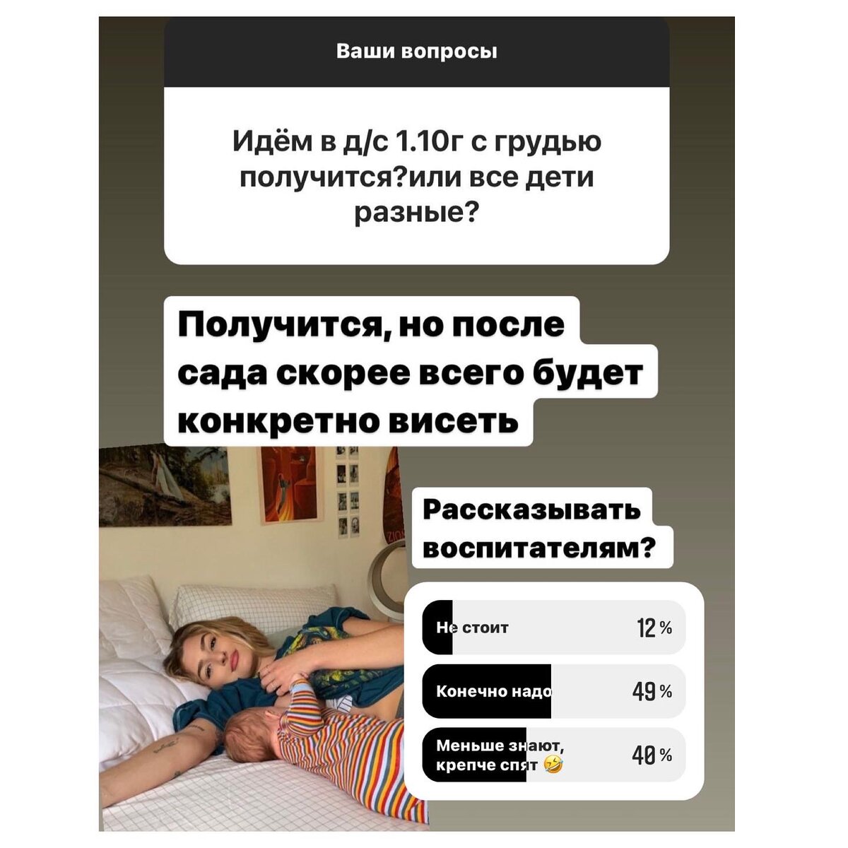 Не отпускает тема детского сада и грудного вскармливания. Это тот вопрос, на который нет однозначного ответа. Давайте по порядку. Если вы очень хотите завершить ГВ и вам пора в сад, то завершите немного отложив выход в сад (пару недель). Далее неделя после завершения малыш идет в сад. Оставив грудное вскармливание нужно понимать, что вы готовы кормить еще неопределенное время. Почему? - потому что никто не знает сколько по времени ребенок будет проходить адаптация. Только после окончания нее рекомендуется прекращение ГВ, а она длится 2 недели - 4 месяца. Нужно понимать, что ребенок может начать зависать после детского сада. У вас продолжается грудное вскармливание. Малыш пошел в детский сад. И тут частый вопрос “Стоит ли говорить воспитателям о том, что у вас все еще…:)” С одной стороны да, хорошо бы сказать. Но ни раз слышала рассказы, что все сложности адаптации “сваливают” на грудное вскармливание. Отношение к долгому грудному вскармливанию разное. Не торопитесь сразу все рассказ