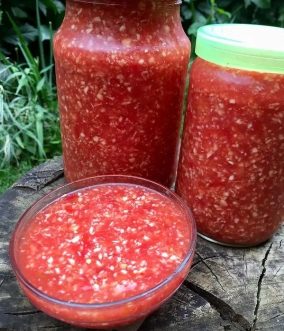 Вкуснятина Ингредиенты: 4 кг томатов 0,5 кг хрена (корни), 2 головки чеснока, 4 ст.л. соли, 1 ст.л. сахара, 5 ст.л. уксуса 9%. Приготовление: Всё пропустить через мясорубку, добавить уксус, соль и сахар, перемешать, разложить по стерилизованным банкам, закрыть стерилизованными крышками, хранить в холодильнике. Хрен можно измельчить блендером если не берёт мясорубка.