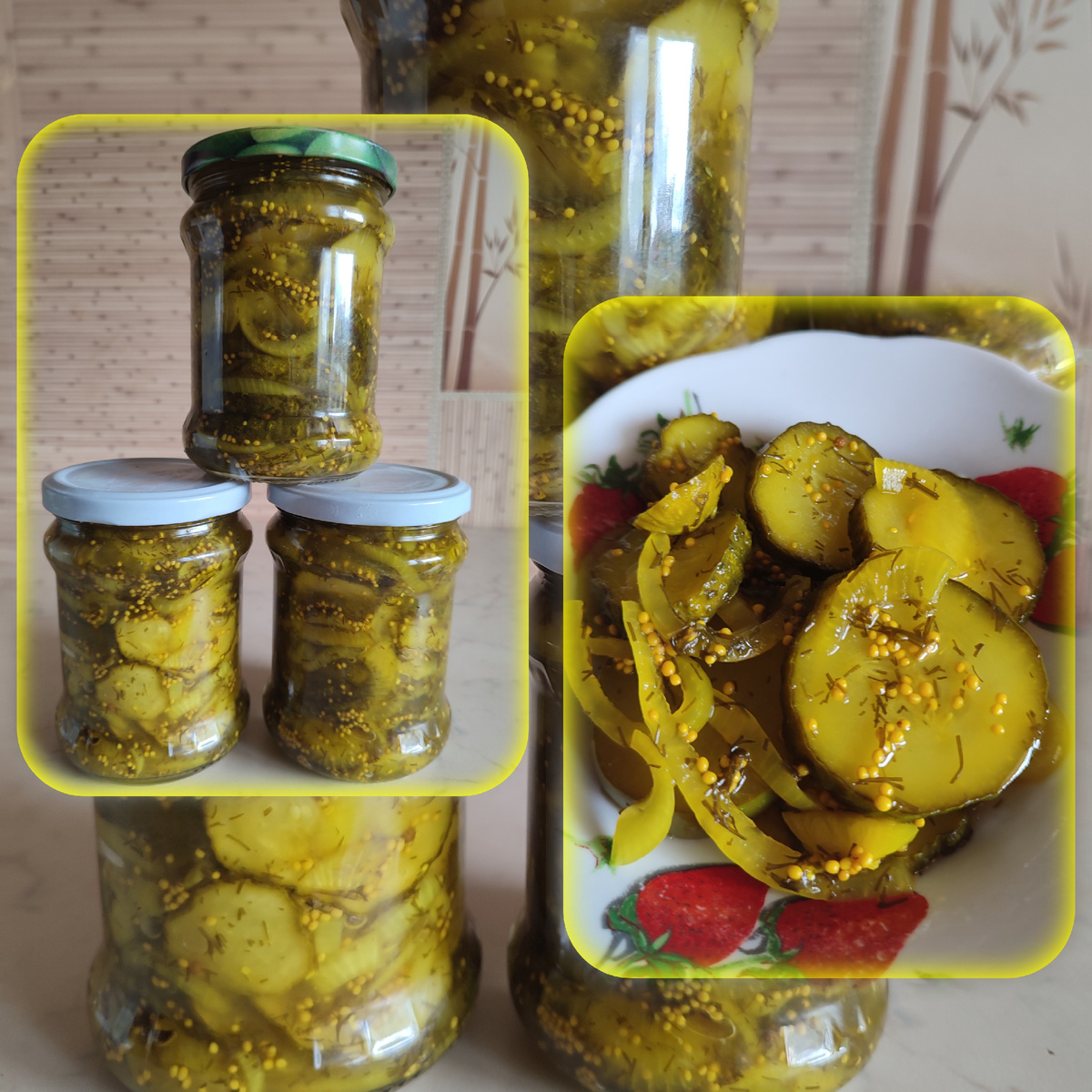 Пряные огурцы для добавления в салаты, пиццу, бутерброды, сендвичи, хот-доги и др блюда. Ингредиенты: 1,2 кг огурцов 250 гр лука 1 пучок укропа 1 ст л соли с горкой 3 ст л сахара 100 мл воды 200 мл яблочного уксуса 2 ст л семян горчицы 0,5 ч л куркумы 1 ч л семян кориандра 10 шт перца горошин душистого Огурцы нарезать кружками по 0,5см, лук - полукольцами. Все ингредиенты соединить в кастрюле, перемешать. Оставить настаиваться на 2-3 часа, переодически перемешивания. Прошло 3 часа, огурцы выделили достаточное количество рассола для варки и заливки. Ставим на огонь, проварить приблизительно в течение 3-5 минут с момента закипания, переодически помешивая. Огурцы должны поменять свой зелёный цвет на желтовато-коричневый. Выключить огонь, горячими разложить в подготовленные банки: аккуратно уплотнить, огурцы должны быть полностью в рассоле, закатать. Перевернуть на крышки, и под шубу до полного остывания. Приятного аппетита! 🤗 Если вам понравился рецепт, 👍 и подписка будет луч