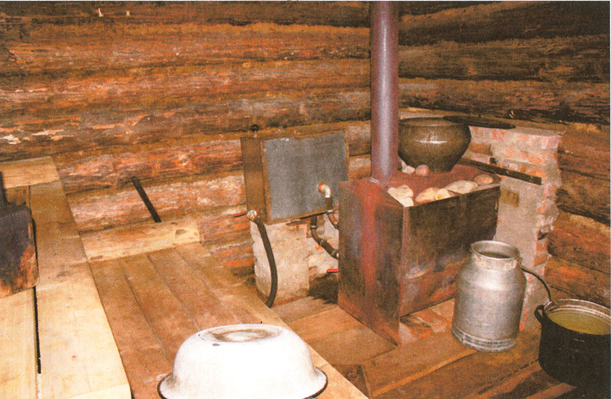 На каменку клали круглые камни-валуны. По словам местных жителей, камни надо было класть обязательно розовые, светлые, и ни в коем случае, не зеленые, иначе можно угореть(отравиться угарным газом). Воду грели в печке большим чугуном, потом стали варить железные коробки (ёмкости для нагрева воды).