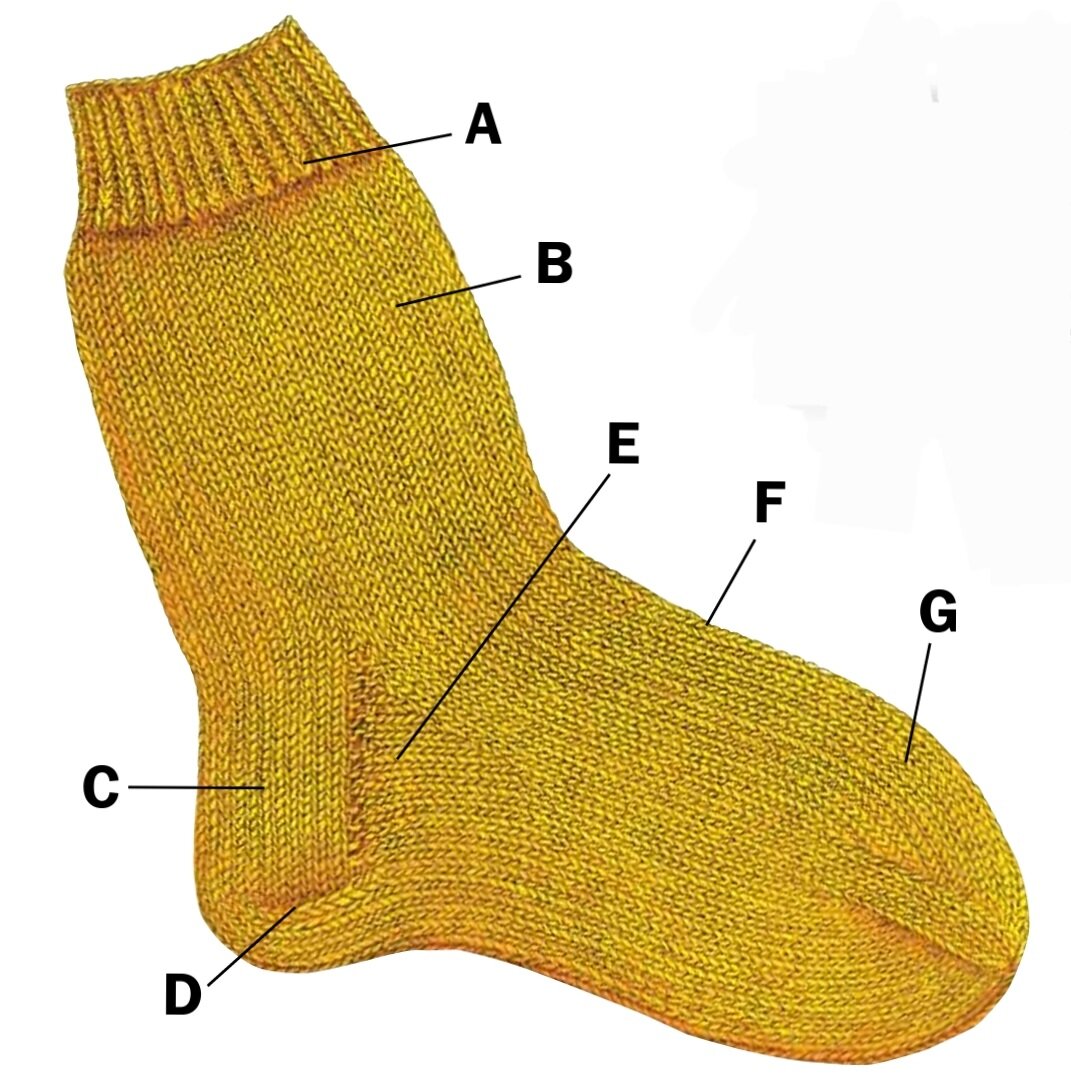 Добро пожаловать на канал @proknit ! В этой статье мы рассмотрим традиционный способ вязания пятки, скорей всего ему могла научить ваша бабушка, но если вы еще никогда на вязали носи, то для вас это статья раскрывающая этапы вязания пятки будет очень полезна. Так давайте перейдем к делу. Для начала давайте рассмотрим все части носка, чтобы лучше разбираться и понимать: А - манжета (резинка или отворот) B - паголенок . высота носка C - стенка пятки (охватывает пятку сзади) D - чашечка пятки ( располагается под пяткой) E - клин подъема стопы (переход от пятки к подошве) F - стопа (вновь вяжется на все 4 спицах) G - ленточный мысок (завершение носка) Набрать петли и равномерно распределить на 4 чулочные спицы. Концевая нить отмечает переход от ряда к ряду в круговом вязании, располагается посередине задней части носка - между 4-й и 1-й спицами. Стенка пятки: отложить петли 2-й и 3 -й спиц. Петли 1-й и 4-й спиц перевести на одну спицу и связать лицевой гладью столько ряд