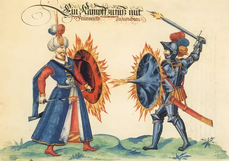 Конспирологи иногда приносят и пользу. По крайней мере, я раньше о существовании этого трактата и не подозревал. А нашли его они, конспиролухи...))) Знакомьтесь, господа: «Фридрих Мейер. "Мастер искусств и фейерверков» 1594 год. И фамилия-то какая знаковая. Интересно, не родственник ли он тому самому знаменитому Иоахиму Мейеру, немецкому мечнику и фехтовальщику, жившему тоже в XVI веке, но несколько ранее? Трактат содержит в себе подробные инструкции по подготовке и запуску фейерверков - со схемами, планами, конструкцией орудий. Демонстрирует также все необходимые инструменты для мастера-фейерверкера (кстати, в общем-то - те же, что использовали и артиллеристы. Собственно, в дальнейшем в русском и немецком языках фейерверкер станет, если не ошибаюсь, унтер-офицерским чином в артиллерии). То, что представляет интерес для меня - это, например, вот эти страницы. Здесь описывается, как силами мастера всего-то шестнадцатого столетия сделать "огненный" меч. Перевести текст я, к сожалению, н