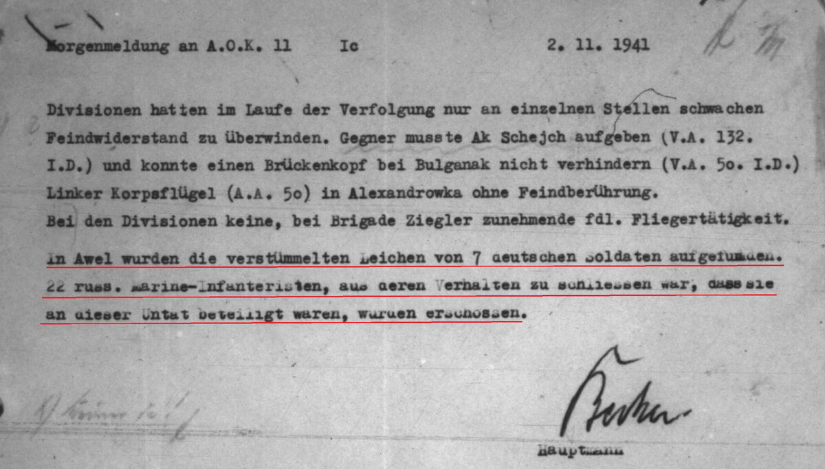 В Авеле была захвачена разведка немецкой 132-й пд (7 человек). Немцы были расстреляны (но этот эпизод в воспоминания не вошел). Правда, потом, при отходе 2-го батальона из д. Авель (Крымское), немцы, захватив отряд прикрывавший отход (22 морских пехотинца) в отместку устроили бойню. Немцы, в принципе, редко щадили моряков.