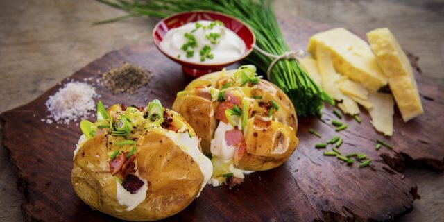 Тем временем поджарьте бекон до появления хрустящей корочки и порежьте его. Достаньте картошку, начините её сыром и беконом и отправьте в духовку ещё на 5 минут, пока сыр не расплавится. Перед подачей украсьте картофель сметаной и рубленым луком.