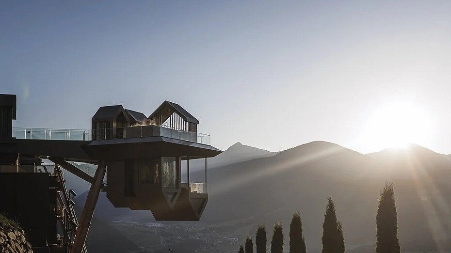 Конструкция будто парит над горным пейзажем. Такого эффекта удалось добиться, закрепив ее на сваях. Архитектурная студия Network of Architecture спроектировала оздоровительный центр Hub of Huts с перевернутыми вверх ногами домами. Его построили в Италии для гостиничного комплекса Hubertus в Южном Тироле, сообщает Dezeen. Как рассказали архитекторы источнику, они хотели показать свою интерпретацию горной деревни. В видении авторов это парящая структура, бросающая вызов гравитации, или настоящее убежище посреди нетронутой природы. Консольная конструкция будто парит в воздухе (высота 15 метров) — такого эффекта было очень сложно добиться, уточнили архитекторы. Ее поддерживают стальные сваи. Их замаскировали под деревья, чтобы не акцентировать внимание на колоннах. Внутрь «домов» ведет подвесной мост. Снаружи сделана открытая терраса, чтобы посетители могли отдыхать на свежем воздухе и любоваться местными видами. Веранду огородили прочным стеклянным забором для безопасности людей. В планир