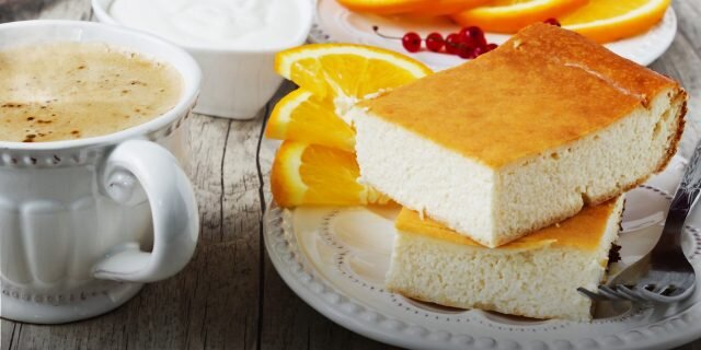 Выложите все ингредиенты, кроме масла, в миску и тщательно взбейте миксером до кремообразной консистенции. Чтобы запеканка получилась пышной, придётся долго взбивать её — около 20 минут.