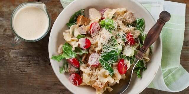 Рецепты полезных блюд для полноценных приёмов пищи с указанием калорийности и БЖУ. 1. Диетический цезарь Ингредиенты Приготовление Грудку нарежьте кусочками, на сухой сковородке поджарьте до готовности. Отварите и нарубите яйцо, натрите сыр, измельчите чеснок. Хлеб нарежьте небольшими кубиками и обжарьте на сковороде или запеките в духовке до хруста. Листья салата порвите руками на небольшие кусочки. Смешайте все ингредиенты в миске, заправьте оливковым маслом. В одной порции: 304 ккал, 25 г белка, 13 г жира, 21 г углеводов. 2. Салат с пастой и лососем Ингредиенты Приготовление Филе лосося оберните фольгой и запекайте в духовке при температуре 180 градусов около 10 минут. Макароны отварите до состояния аль денте. Томаты порежьте на четвертинки. Фриссе помойте. Смешайте ингредиенты в миске и заправьте песто. Этот салат можно съесть тёплым. В одной порции: 267 ккал, 19 г белка, 9 г жира, 28 г углеводов. 3. Салат с говядиной и печёным баклажаном Ингредиенты Приготовление: Говядину нарежь