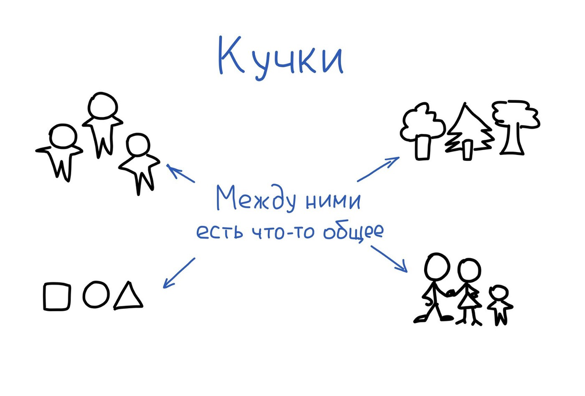 Отрывок из книги “Визуальная упаковка смыслов” При визуальном восприятии информации есть множество принципов, по которым наша визуальная система (глаза и мозг) разделяет, объединяет или выделяет визуальные объекты. Иначе говоря, в мозге происходит некая нейрокогнитивная “визуальная сортировка”. Принципов визуальной сортировки очень много. В книге мы выделим и кратко опишем 7 основных принципов визуальной сортировки. На мой взгляд, они наиболее легки для понимания и применения на практике. Кучки. Первый принцип назовём “Кучки”.