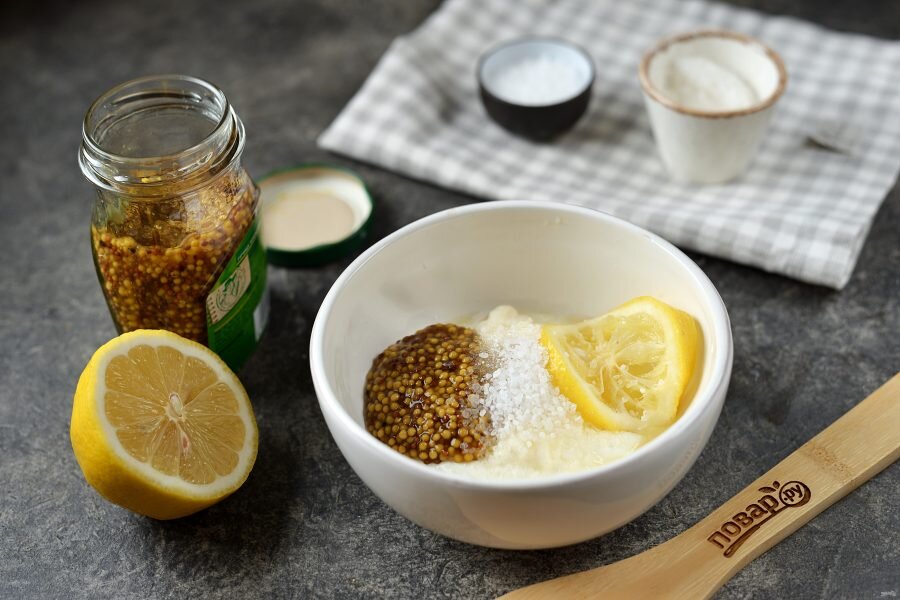 Первым делом займитесь заправкой. В небольшой миске соедините майонез, горчицу, сметану, сахар и соль. Выжмите сок лимона.