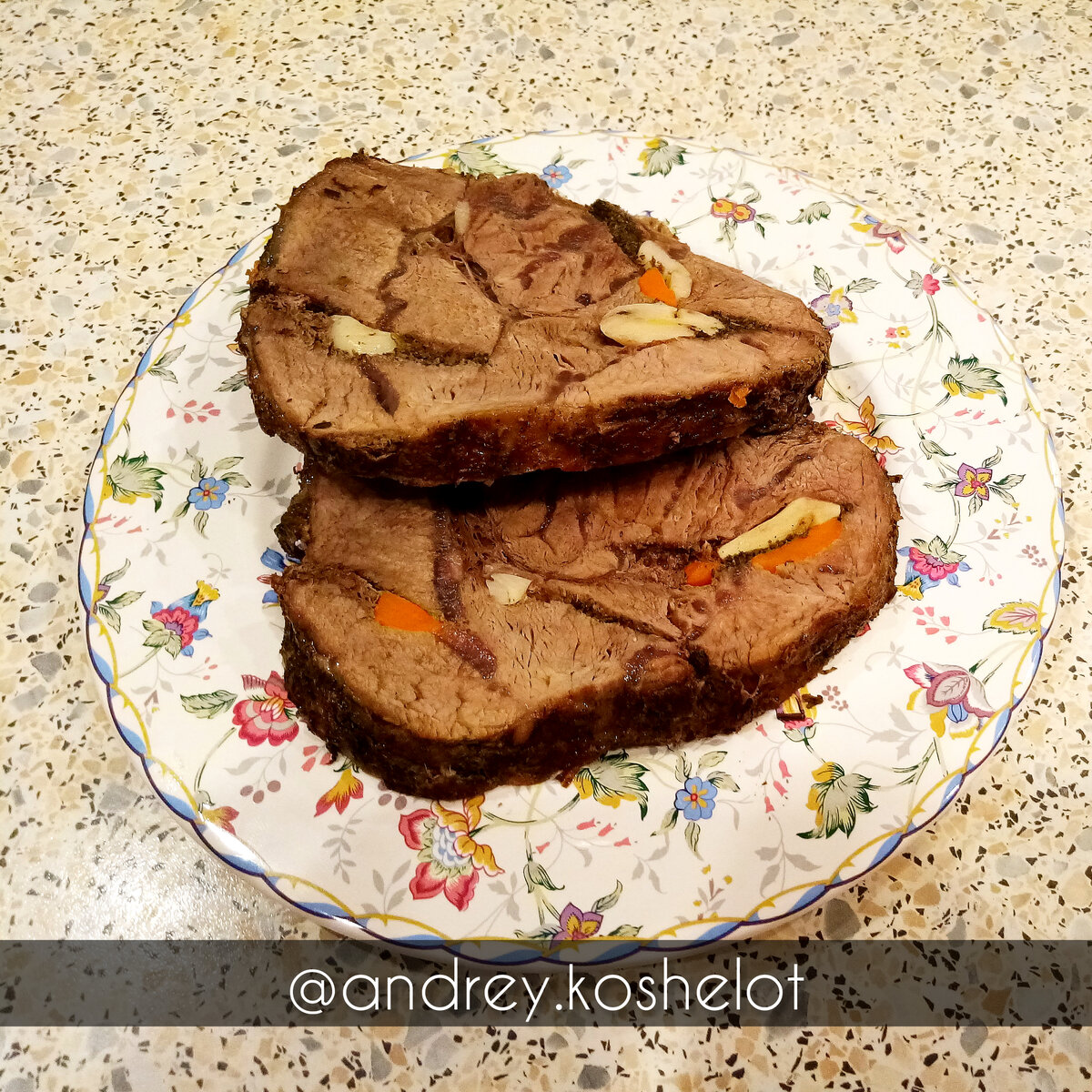 6. Специи: перец черный свежемолотый, кориандр, базилик сушеный, орегано, розмарин, соль. Количество по вкусу; Способ приготовления: 1. Мясо промываем под холодной водой. Делаем глубокие надрезы – 5-7 шт по всему куску. С кончика ножа засыпаем в них смешанные специи. Затем вкладываем туда же слегка придавленые зубчики чеснока, потом по кусочку сливочного масла, и в само масло брусочек морковки – по типу клина, что бы закупорить наши надрезы. 2. Затем обтираем специями всю поверхность говядины. Обвязываем бечевкой мясо, придавая правильную форму и стягиваем, что бы сок не вытекал, тогда говядина останется сочной. 3. На сковородке с подсолнечным маслом, обжариваем говядину до золотистой корочки со всех сторон, даже с торцов, удерживая щипцами или чем вам более удобно, как бы запечатывая мясо, для того, что бы внутри оно оставалось сочны