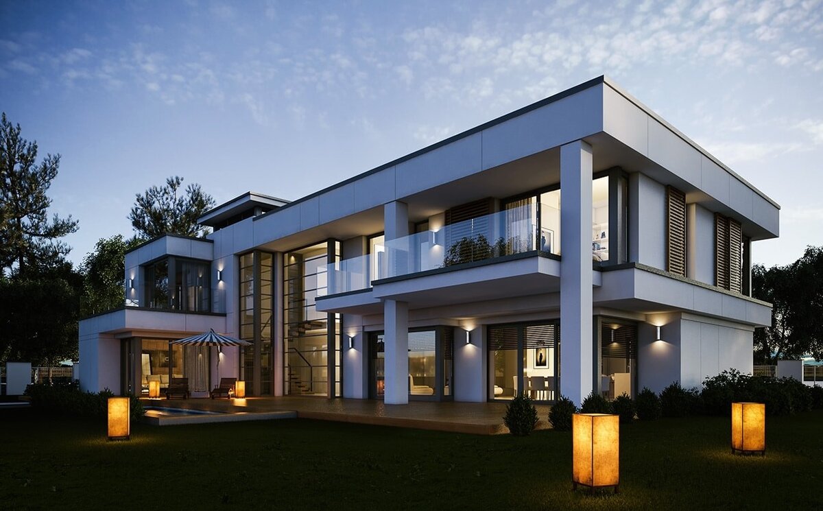 Роскошный особняк для семьи из 4-7 человек. Архитектура дизайна дома сочетает в себе современную форму и функциональность решений. Дизайн виллы выглядит очень величественно как снаружи, так и внутри. Проект дома имеет полезную площадь 363,71 м.2 ДИЗАЙН ДОМА Фасад виллы украшен каменной стеной. Вход с широкими дверями ведет через крытую площадку прямо в застекленный вестибюль, и гостиную с красивым высоким окном, с видом на сад. На фасаде дома есть хитро спрятанная дверь в большой гараж. ИНТЕРЬЕР В интерьере дома спроектировано роскошное жилое пространство на первом этаже. Дом состоит из смежных комнат вестибюля, гостиной, столовой, красивой лестницы и большой кухни. В проекте на первом этаже есть дополнительные подсобные помещения, технические помещения и функционально спроектированный тройной гараж и кабинет. Второй этаж проекта - это четыре красивые спальни с собственными гардеробными и ванными комнатами. Дизайн дома спланирован функционально и с акцентом на воздушное пространс