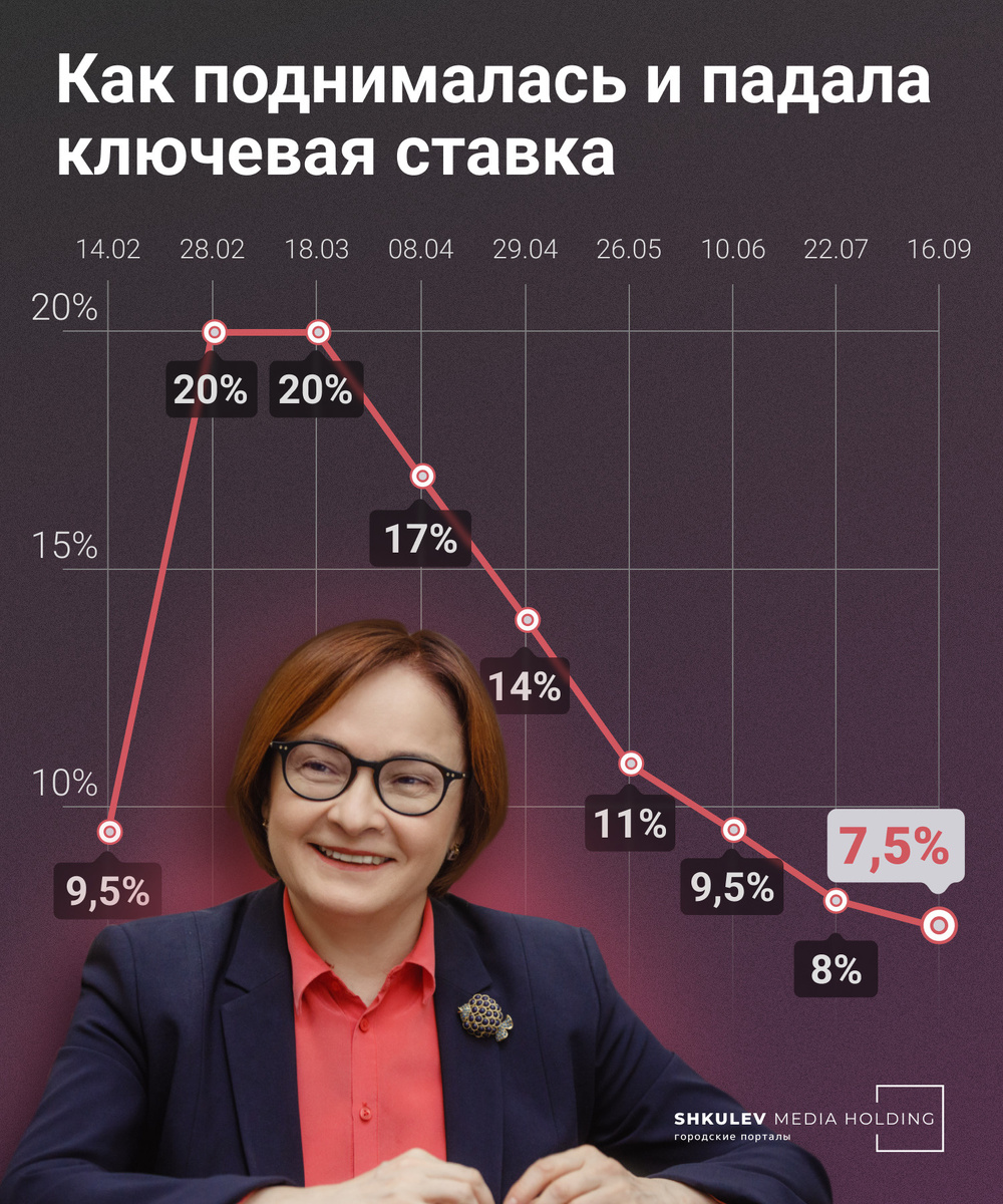 Банк России вновь снизил ключевую ставку: на этот раз на 0,5 процентного пункта, до 7,5% годовых. Последний раз ставка была настолько низкой еще в 2021 году: 26 октября ее подняли с 6,5 до 7,5%. Что касается депозитов и кредитов, то и здесь реакция на решения Центробанка стандартная. Если ставка снижается, то снижаются проценты и по вкладам, и по кредитам. Если растет, то происходит ровно наоборот. Так что через неделю после оглашения решения ЦБ можно ждать реакции банков, — пояснил специалист департамента стратегических исследований Total Research Николай Вавилов.