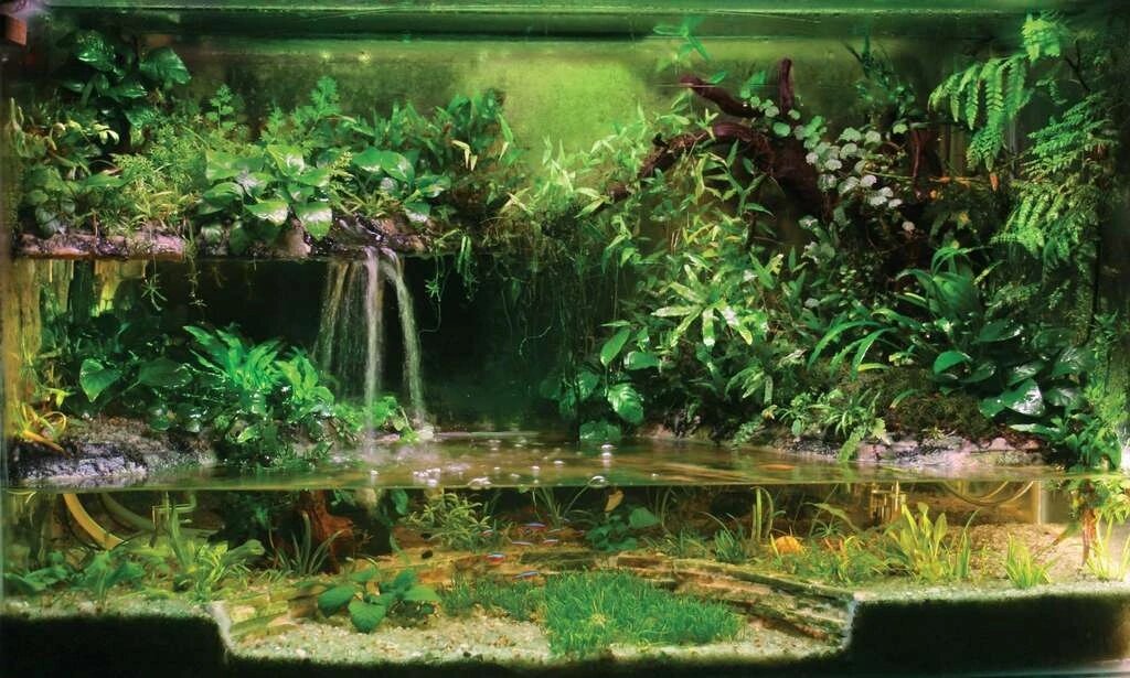 Любой палюдариум состоит из двух частей – водной (погружной) и наземной (или прибрежной). Их соотношение практически ничем не ограничено и может выбираться на усмотрение и сугубо по эстетическим принципам, подбираться по своему вкусу и желаемым растениям. Но сухая, или береговая зона в палюдариумах должна хотя бы чуть-чуть доминировать над водной. Несмотря на возможность импровизации, принципы обустройства всех палюдариумов идентичны: На дне контейнера располагают слой почвы или грунта, в который высаживают водные растения. Почва может быть самой разной – продезинфицированным универсальным субстратом, смесью листовой почвы и гравия в соотношении 1 к 3 с добавкой толченного угля или специальным грунтом для водных садов и аквариума. Разделяют пространство палюдариума на водную и береговую часть – устанавливают перегородку и засыпают «берег» из дренажа, плодородного и декоративного грунта, создавая сушу. Обычно ее размещают у дальней стенки емкости или смещают к одному из углов. При