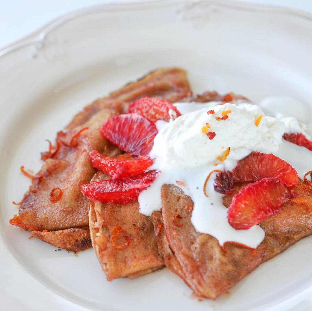 Огненные они именно потому, что их поджигают! ИТАК! Слушайте рецепт. КРЕП-СЮЗЕТТ или как вчерашние блины могут превратиться в изысканный французский десерт со спецэффектами😅 Сегодня я расскажу вам про один утонченный способ подать блины к столу. Если у вас осталось несколько штук от блинного запёка, то это идеальный повод приготовить из них изысканный десерт. Базовый рецепт здесь. На 1 порцию 🔸 Готовые блинчики 3 шт 🔸 Сливочное масло 25 г 🔸 Сахар 25 г 🔸 Цедра апельсина 2 г 🔸 Сок апельсина 50 г 🔸 Ликер куантро 20 г Можно использовать коньяк или ром вместо ликёра. Для подачи: Взбить 🔸 сливки 33% (50г) с сахарной пудрой (5г) или продавать с шариком ванильного мороженого. 🔸 Очищенные от перегородок дольки апельсина. Апельсин используйте обычный или красный. Готовим! Начинаем с карамельного соуса. Разогреваем сковороду с толстым дном, бросаем на неё сливочное масло, французы его обожают. Пока масло нагревается, добавляем к нему цедру и сахар. Далее вливаем сок апельсина. Сворачива